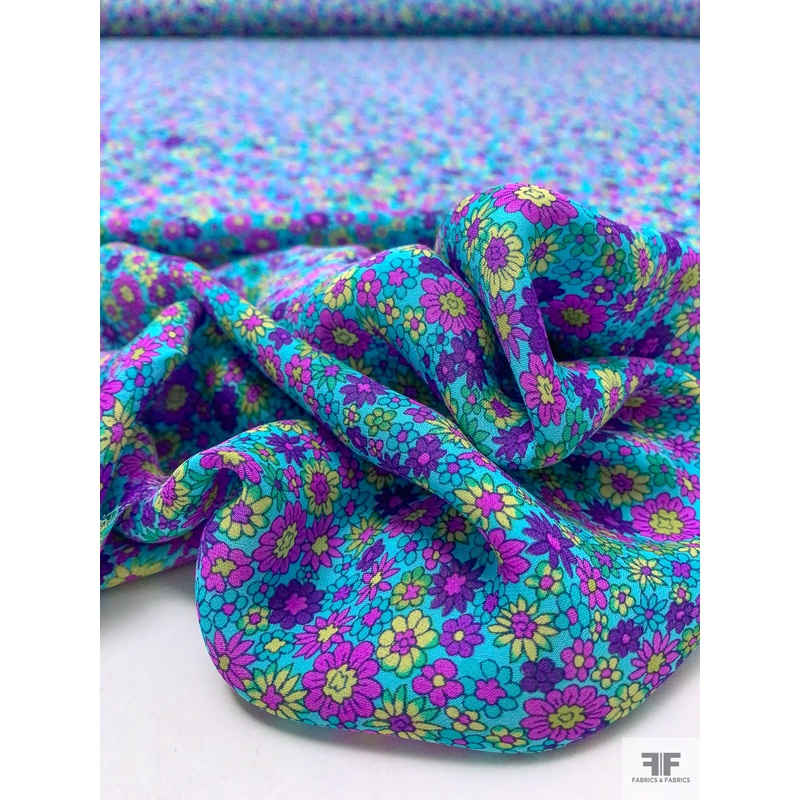 Ditsy Floral Printed Silk Georgette – Aquamarine / Purple / Magneta / Yellow Fabric by the Yard