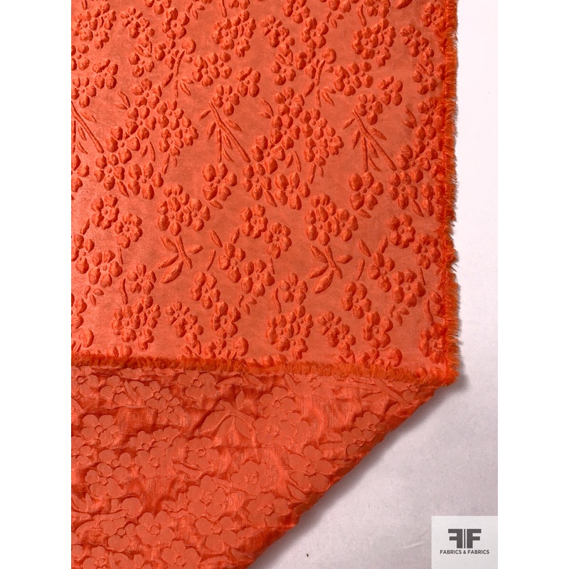 Vibrant and full of character, this Italian floral bundles organza-brocade blends bold texture with a saturated orange hue. The opaque, medium-weight fabric features a structured hand and minimal drapeideal for fashion suiting, tailored dresses, dramatic s