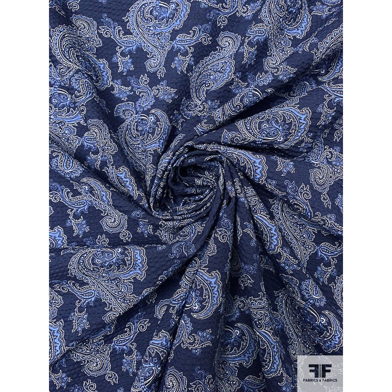 Italian Paisley Printed Lightweight Seersucker Cotton Lawn – Navy / Soft Blue / White Fabric by the Yard