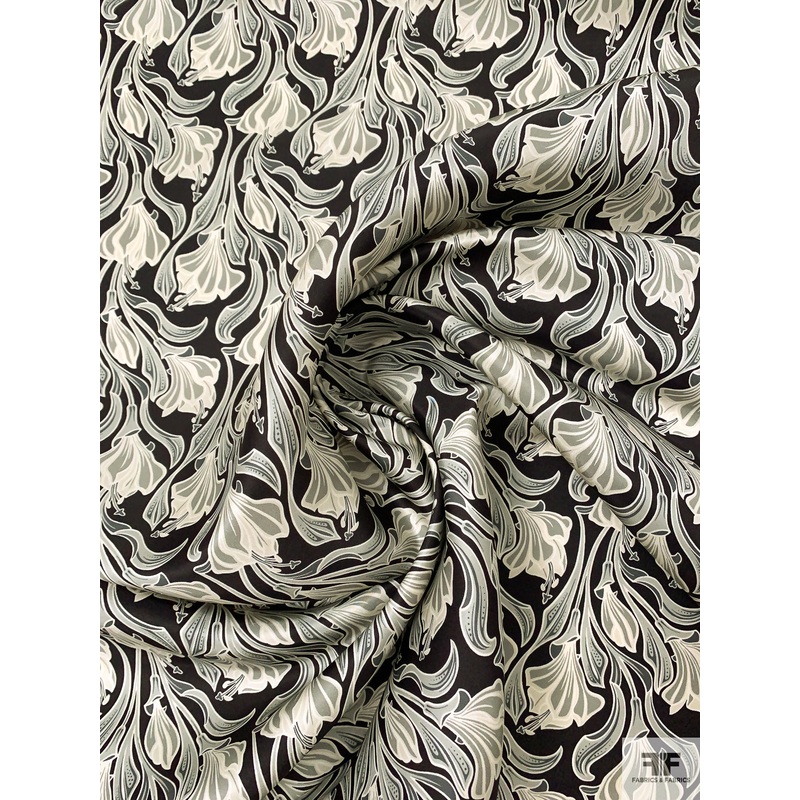 Moody and sophisticated, this Italian silk razmir features a wilting floral print in black, grey, and off-white for a dramatic, painterly effect. With its smooth texture, structured hand, and minimal drape, its ideal for tailored jackets, sculptural gowns,