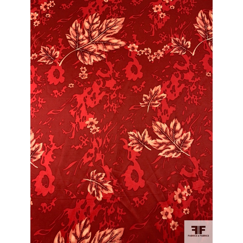 Leaf Printed Silk Charmeuse – Red / Dark Red / Light Peach Fabric by the Yard