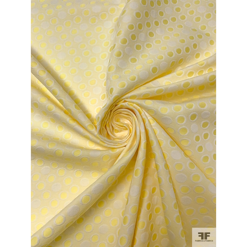 Fresh and playful, this Swiss-made brocade features a crisp circle design in sunny yellow and white. With its slightly textured surface and minimal drape, its ideal for structured pieces like tailored jackets, mod skirts, or polished home accents. A charmi