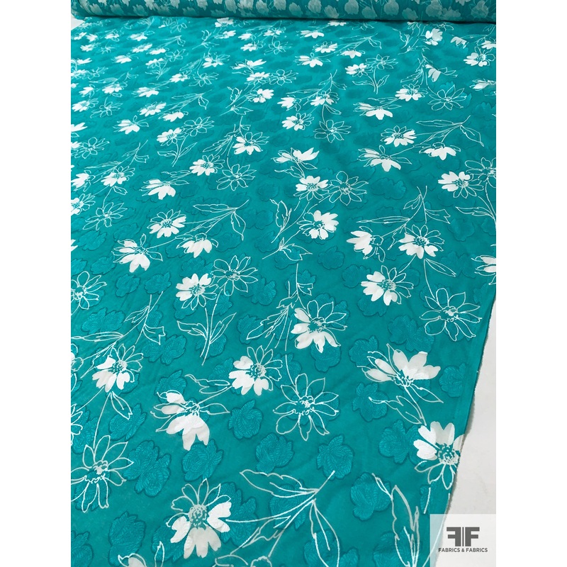 Made in Switzerland Floral Burnout and Printed Jacquard Cotton Voile – Aquamarine / White Fabric by the Yard