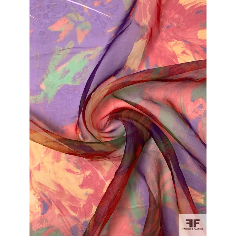 Painterly Bold Floral Printed Polyester Organza – Fire Orange-Yellow / Purple / Green Fabric by the Yard
