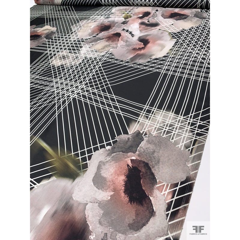 Stencil Lines and Floral Printed Silk-Wool Mikado – Black / Pearl White / Greys / Dusty Peach Fabric by the Yard